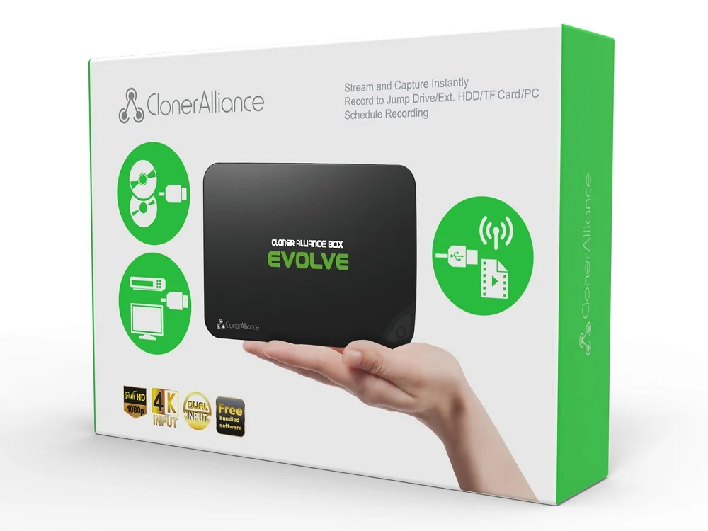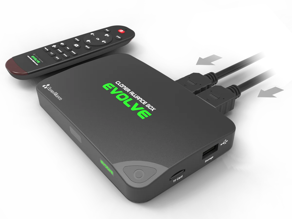 ClonerAlliance Box Evolve is a standalone video capture box to record videos from any video source to your USB flash drive/TF card/PC. Designed with 2 HDMI and 1 AV inputs, you can switch the ready input signal in real time and digitize your old videos. The output video encodes in H.264, ensuring your video will be compatible with almost any device platform. With the custom remote control, stay on the couch and press one button to start recording now!