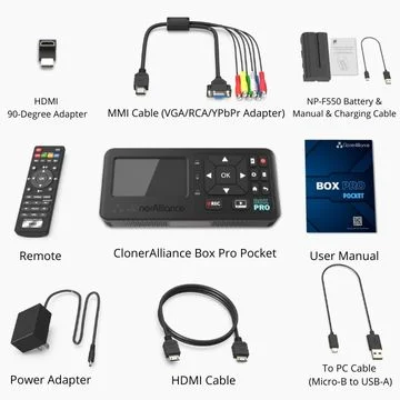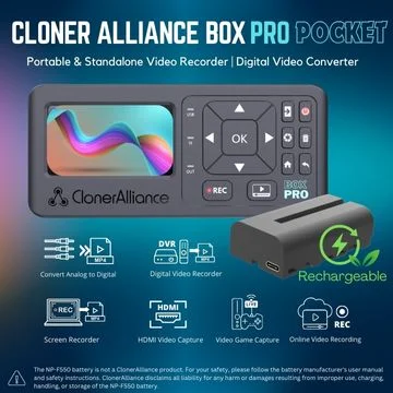ClonerAlliance Box Pro Pocket is a portable standalone video recorder featuring a built-in 3-inch screen for instant playback, making it easy to record without an external monitor. It runs on battery power, enabling you to capture 1080p@60fps HD videos anywhere, without requiring a power outlet.