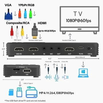 | Compatible Video Sources | Hi8 camcorders, VHS Players, VCRs, DVRs, Set top Boxes, Cable TV Receivers, DVD Players, Media players, TV Sticks, Endoscopes, Surgery Microscopes, Game Consoles, VGA Graphic Cards, Laptops with HDMI/VGA OUT. [The Smart TV & TV Antenna can't be a video Source.] |