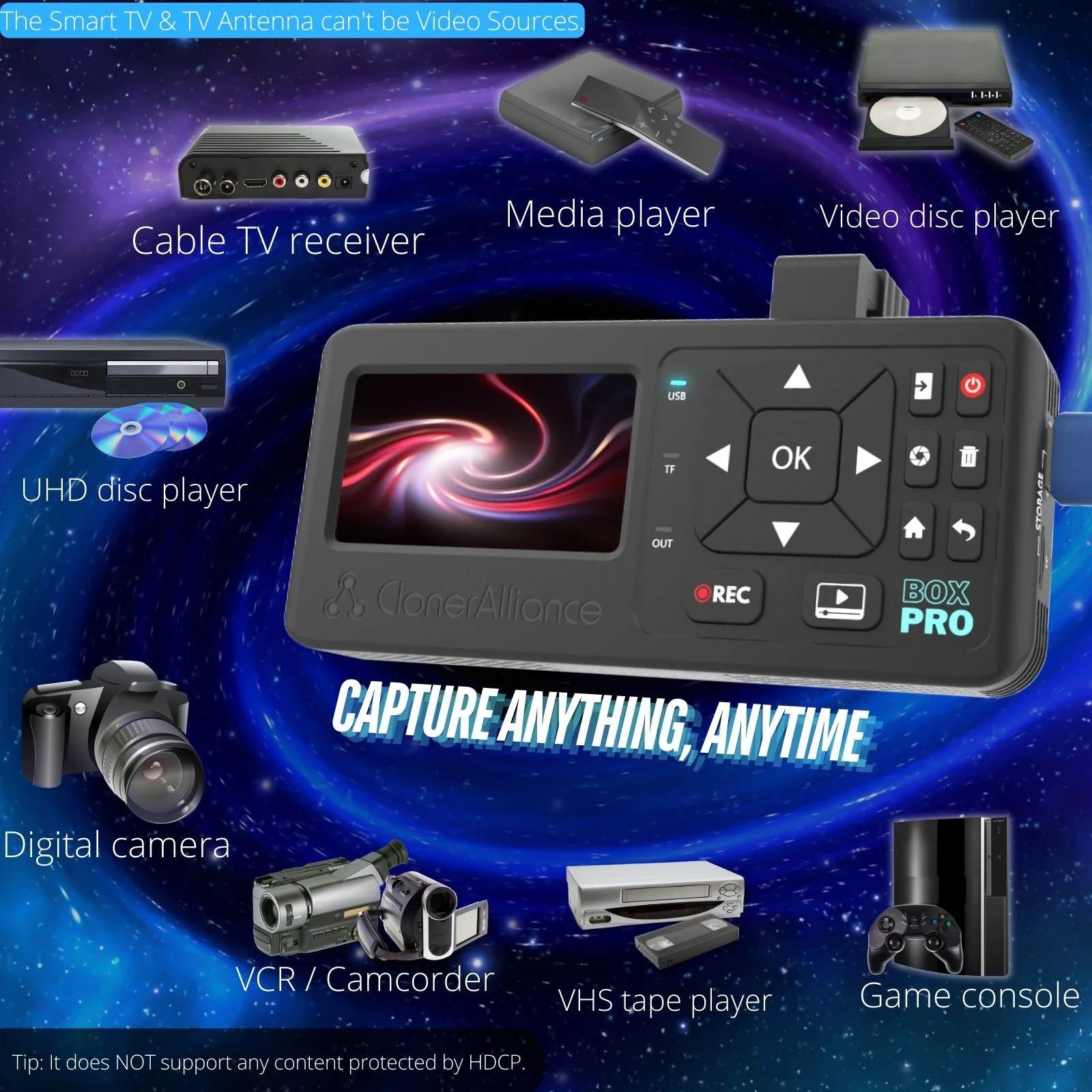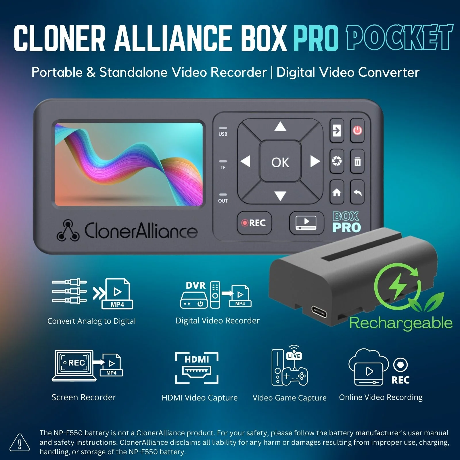 ClonerAlliance Box Pro Pocket is a portable standalone video recorder featuring a built-in 3-inch screen for instant playback, making it easy to record without an external monitor. It runs on battery power, enabling you to capture 1080p@60fps HD videos anywhere, without requiring a power outlet.