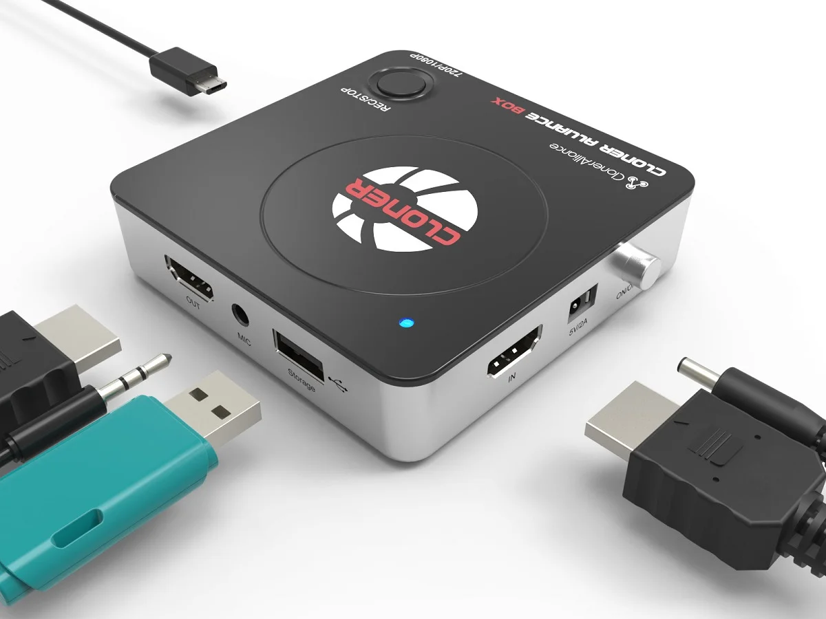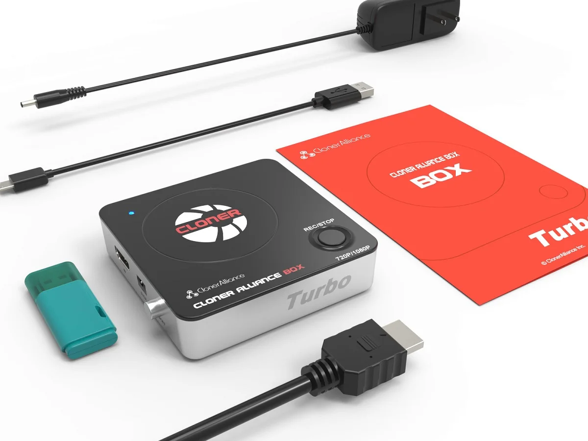 ClonerAlliance Box Turbo is a standalone HDMI video recorder, which enables you to record videos/gameplay from any HDMI video source onto your USB flash drive or external hard drive. It also works with 3rd party software for you to record and live stream games on Windows PC/laptop. The schedule recording feature in bundled software makes it possible to record videos automatically when you are away from home or at work.