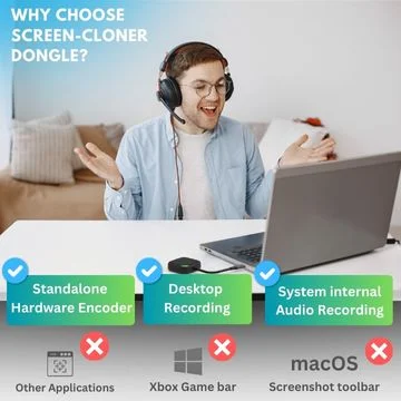 Compared to Mac OS’s Screenshot toolbar and QuickTime Player, ClonerAlliance Screen-Cloner Dongle offers key advantages. While Mac’s tools cannot record internal system audio without third-party software, the Screen-Cloner Dongle captures both system audio and video seamlessly. It also supports long-duration, high-quality recordings in 1080p@60fps, using hardware encoding to minimize system load. In contrast, Mac’s tools can impact system performance during extended recordings and lack the ability to capture everything on the desktop.