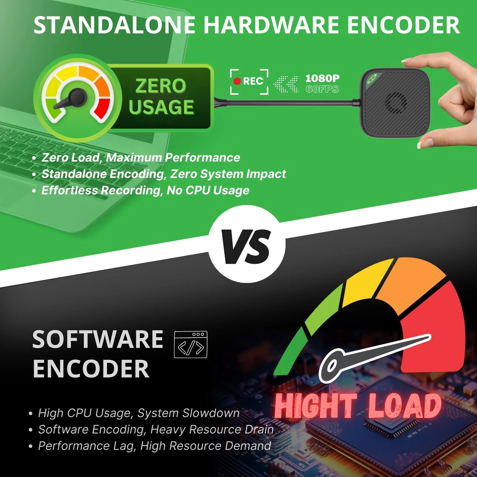 ClonerAlliance Screen-Cloner Dongle uses hardware encoding, offering significant advantages over software-based recording tools. With hardware encoding, the dongle performs video processing independently, minimizing the load on your computer's CPU and RAM. This ensures smooth performance, even during long recording sessions, without causing system lag or crashes. In contrast, software-encoded screen recorders heavily rely on system resources, which can lead to slowdowns, especially on lower-spec machines.