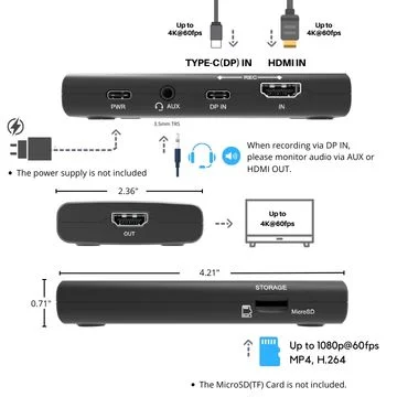 Capture video from HDMI or USB-C DP sources directly to MicroSD card. No PC required. No drivers needed.